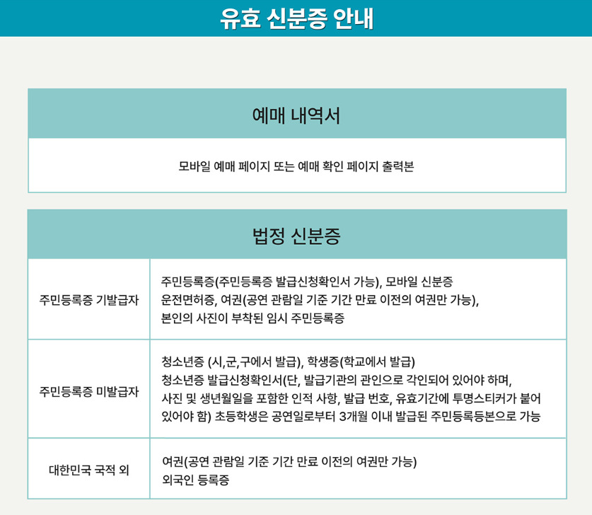 공연 입장을 위해 반드시 본인 확인 가능한 신분증을 지참해야 합니다. 아래 표를 참고하세요.