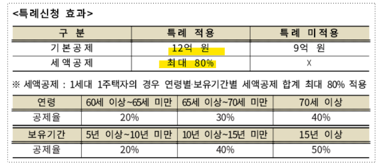 - 기본공제 적용: 과세 기준일 시점에 1세대 1주택자로 간주되어, 기본공제 12억 원과 함께 세액공제 혜택을 받을 수 있습니다.