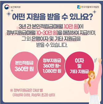 √ 차상위초과 : 기준 중위소득 50% 초과~100%이하, 만 19세이상(신청 월 전월에 만19세된 자)~만34세이하, 월 50만원 초과~ 월 230만원이하인 사람. ≫ 매월10만원 정액지원.(3년)