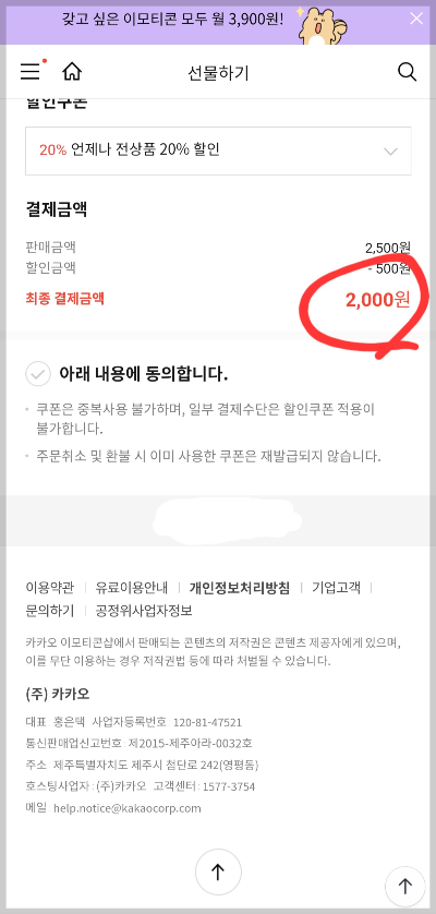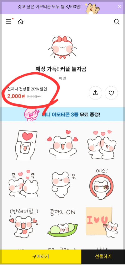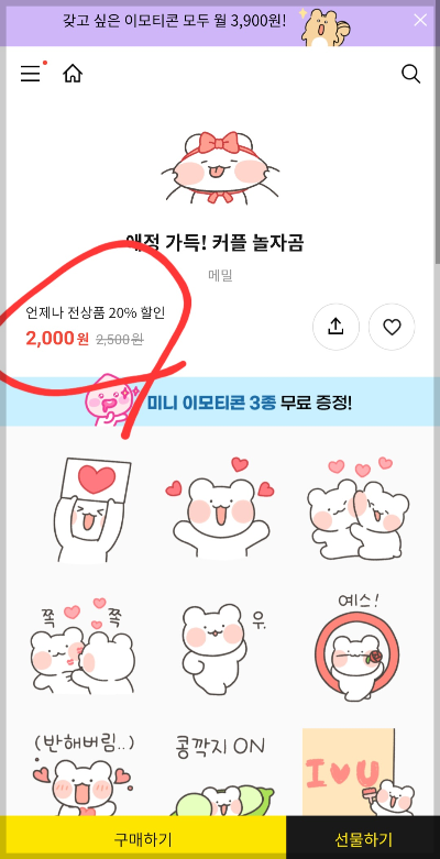 그래서 이모티콘을 싸게 살 수 있는 방법을 저번에 본 건 있어서 이것저것 해봤어요. 처음에는 할인 되지 않는 금액만 계속 떠서 어떡하지 하다가 방법을 검색해서 알아내서 2,000원에 구매해서 선물했어요. 간단하게 할 수 있는 방법 2가지 알려드릴게요.