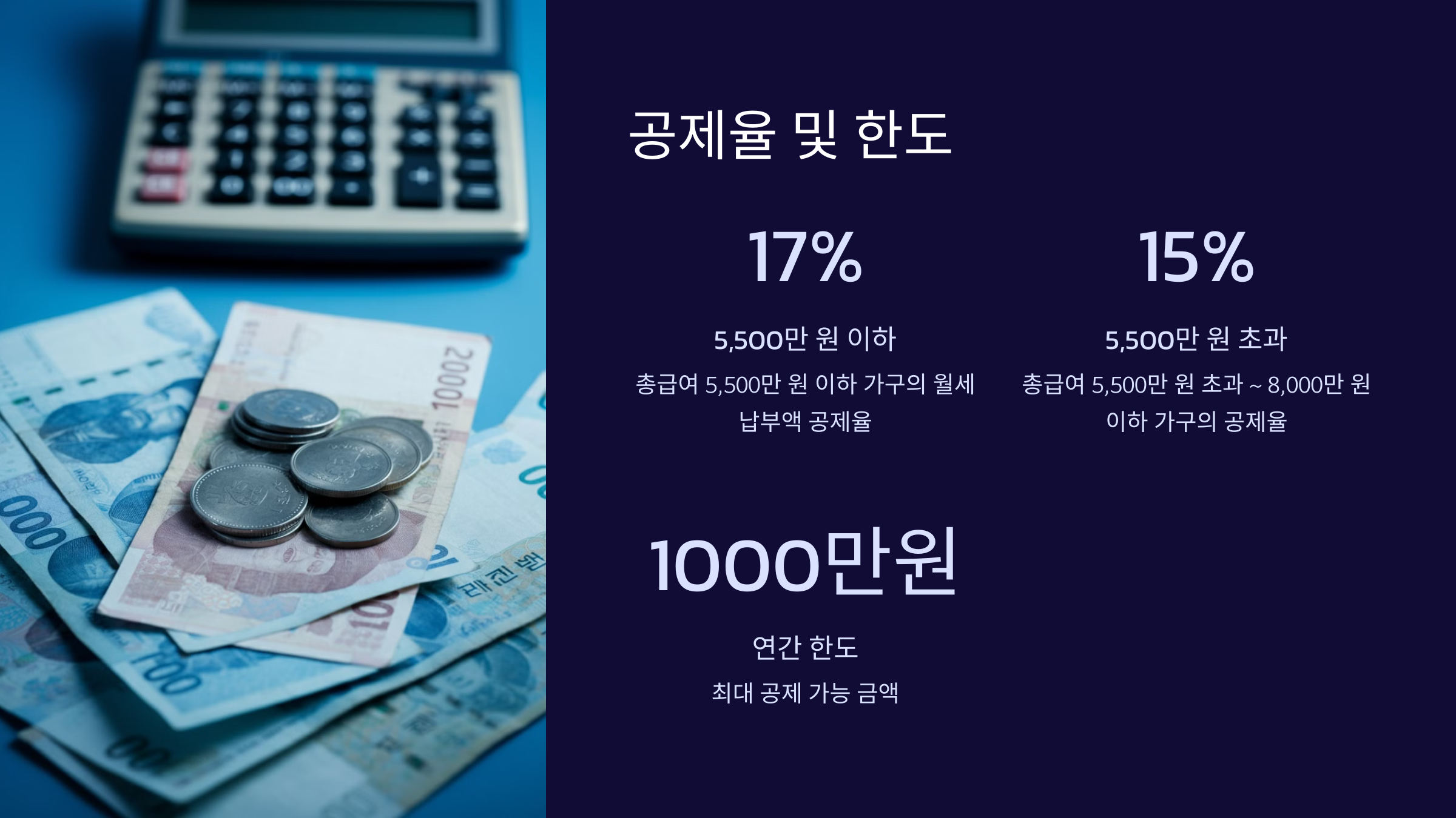 - 총급여 5,500만 원 초과 ~ 8,000만 원 이하: 월세 납부액의 15%.