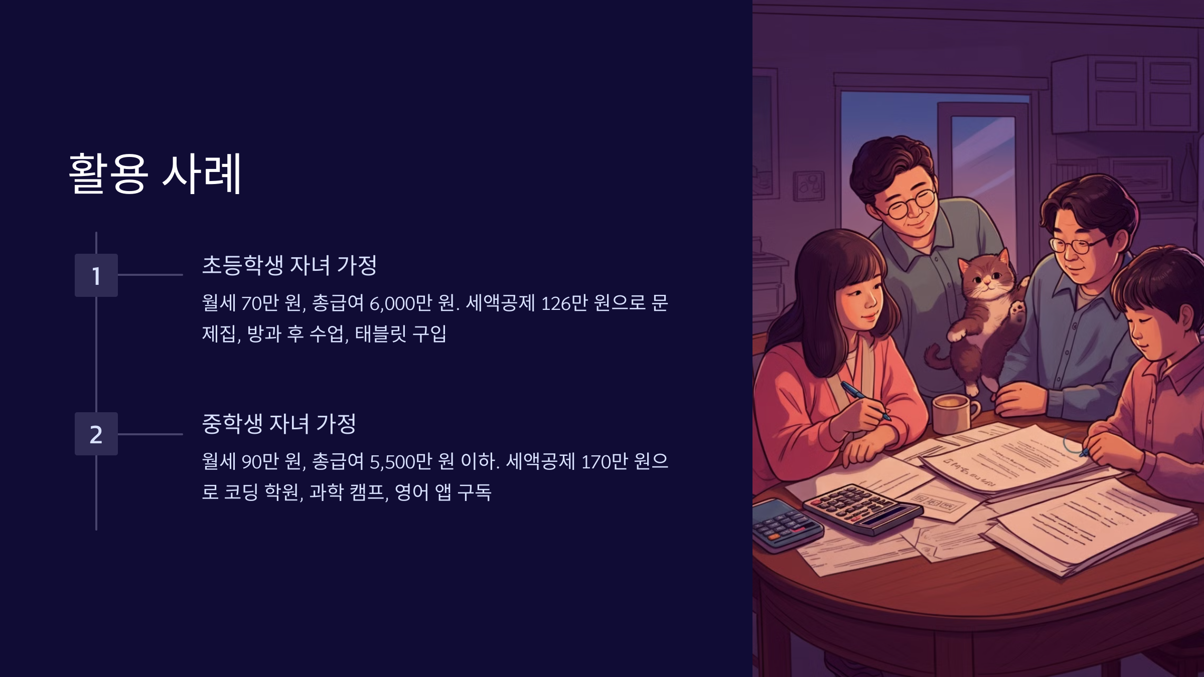 특히 학부모 가구는 세액공제를 통해 주거비 부담을 덜고, 절약한 금액을 자녀 교육비로 활용할 수 있습니다.