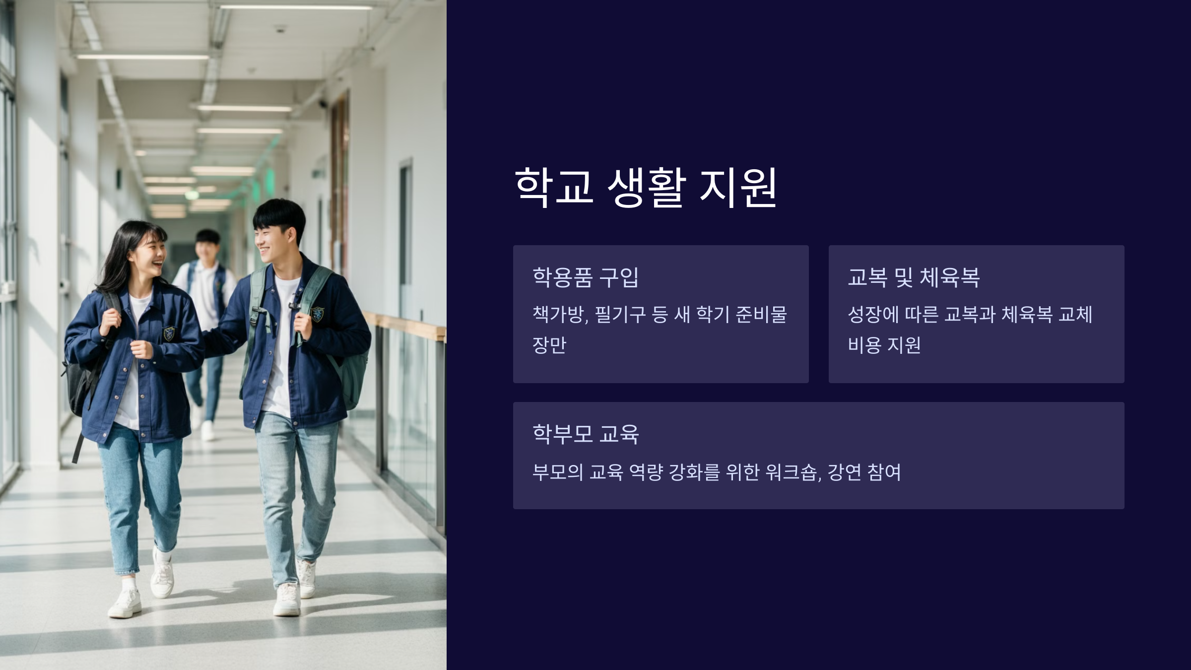 - 자녀가 성장함에 따라 교복과 체육복 구매 비용도 필요합니다. 절약한 금액으로 부담을 덜 수 있습니다.