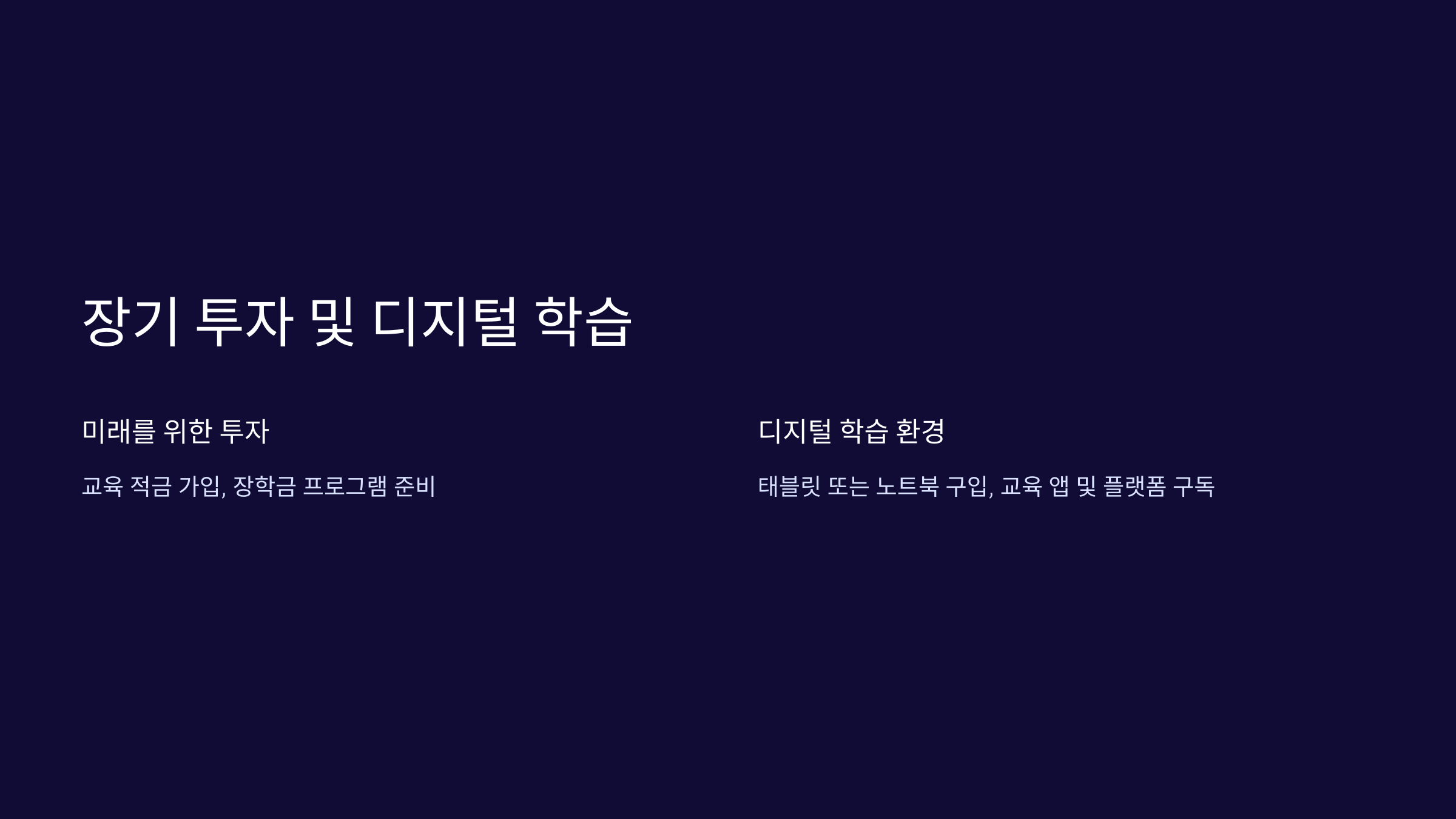 - 디지털 학습 환경은 요즘 필수적입니다. 절약한 돈으로 자녀에게 적합한 디지털 기기를 구입해 학습 효율성을 높이세요.