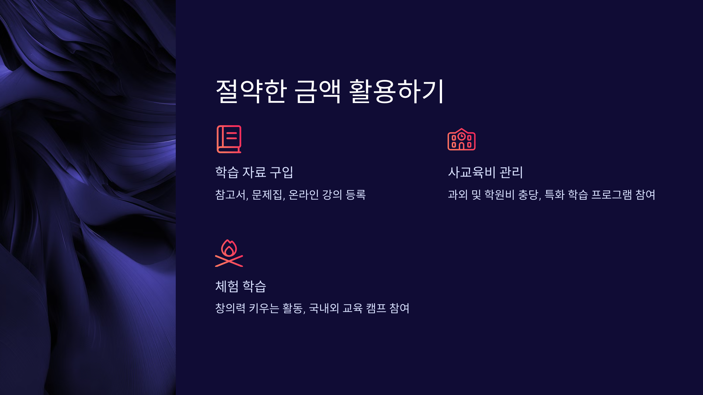 - 절약된 돈으로 자녀의 성적을 높이거나 필요한 활동에 참여하게 하여 장학금 기회를 넓히는 것도 추천됩니다.