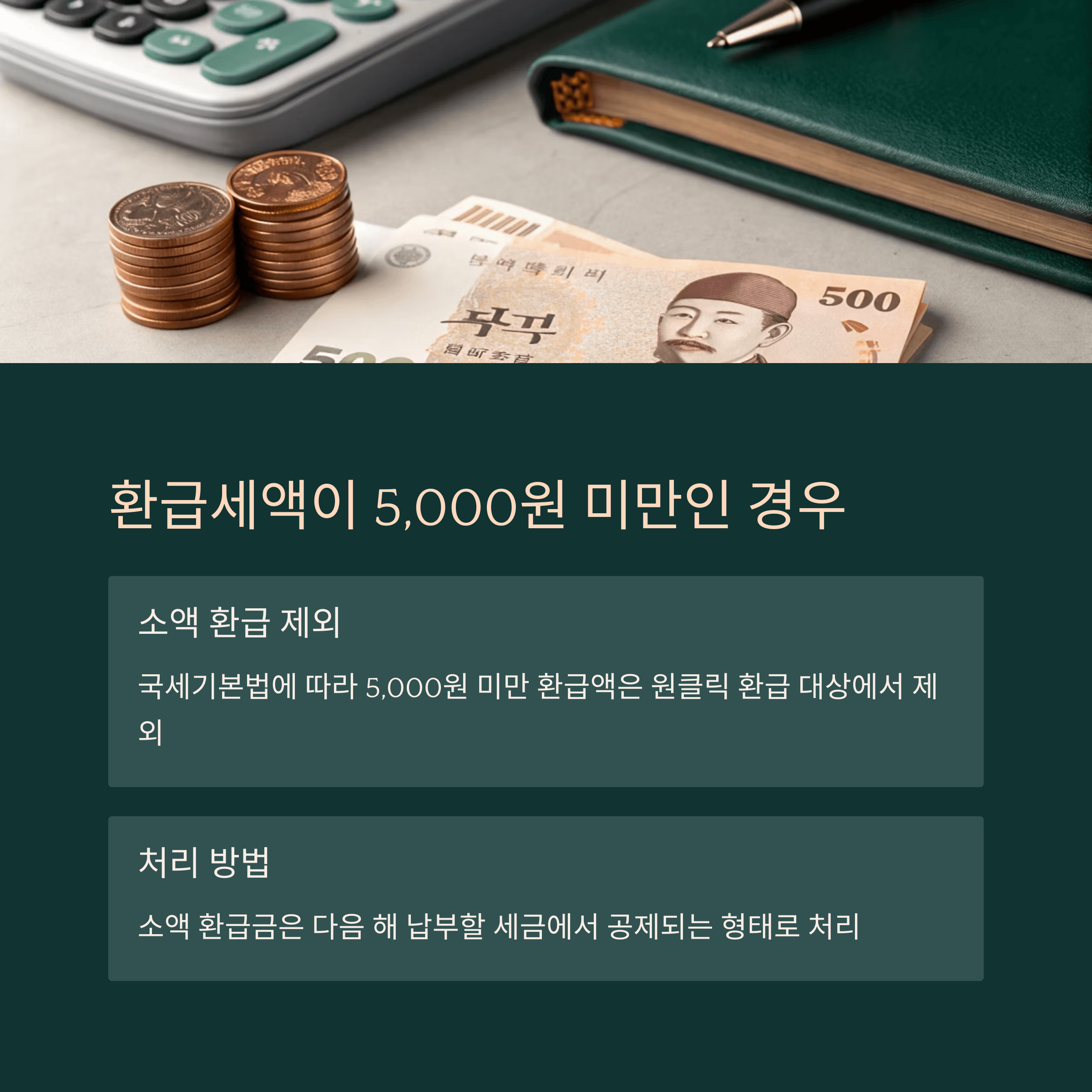 - 5,000원 미만의 환급액은 국고에 귀속되는 것이 아니라, 향후 세금에서 차감됩니다