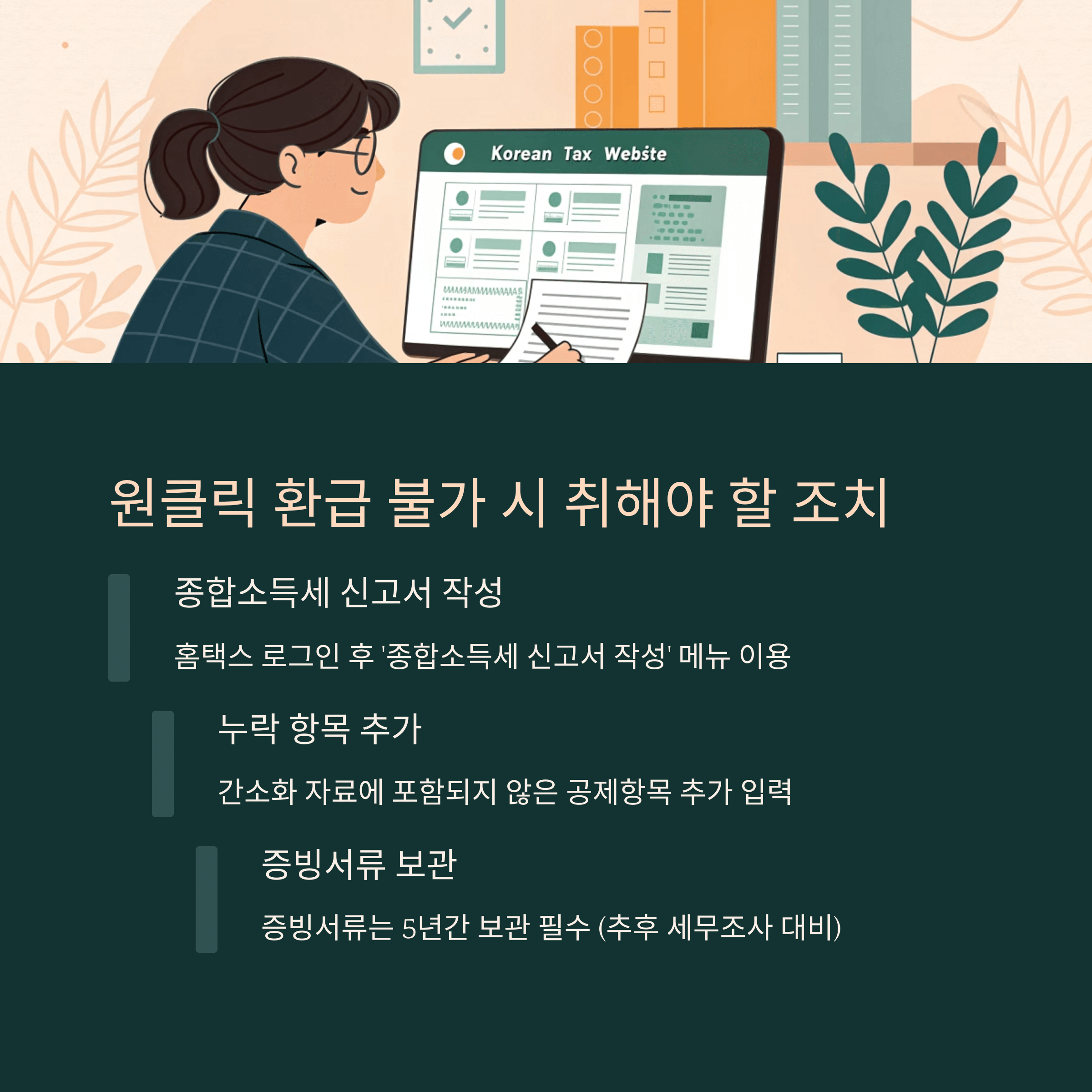 - 다음 연도에는 신고 기간 초기에 원클릭 환급 가능 여부를 먼저 확인하세요